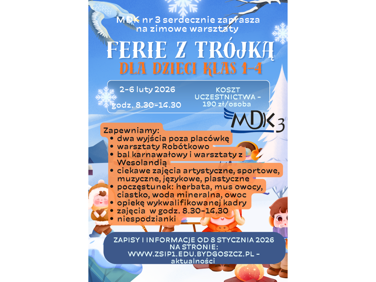 Szanowni Państwo informujemy, że jak co roku nasza placówka organizuje warszaty zimowe FERIE Z TRÓJKĄ dla dzieci z klas 1-4 w czasie ferii zimowych w dniach 2-6 lutego 2026 r. Ilość miejsc ograniczona. Koszt uczestnictwa 190 zł/osoba. Zapewniamy atrakcje, wyjścia poza placówkę, poczestunek (woda mineralna, herbata, owoc, ciastko, mus owocowy), zajęcia na terenie placówki i poza. Nie zapewniamy posiłków, dzieci przynoszą drugie śniadanie z domu. Szczegółowe informacje na plakacie. Zapisy od 8 do 14 stycznia 2026 r. w formularzu, który będzie aktywny od jutra od godz. 8.00 WYŁĄCZNIE NA STRONIE INTERNETOWEJ PLACÓWKI. W PRZYPADKU DUŻEJ ILOŚCI CHĘTNYCH ZAPISY MOGĄ ZAKOŃCZYĆ SIĘ PO UZYSKANIU WYMAGANEJ ILOŚCI OSÓB.