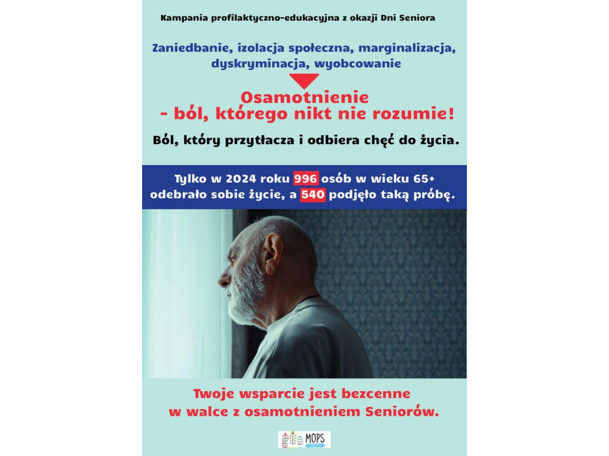 Każdego roku w październiku i listopadzie obchodzone są Dni Seniora, 1 października świętowany jest Międzynarodowy Dzień Osób Starszych, 20 października Europejski Dzień Seniora, natomiast 14 listopada Światowy Dzień Seniora oraz Ogólnopolski Dzień Seniora. W Polsce tysiące osób starszych każdego dnia doświadcza samotności – nie tej chwilowej, ale tej długotrwałej, bolesnej i niezrozumianej. Kampania bydgoskiego Miejskiego Ośrodka Pomocy Społecznej „Osamotnienie – ból, którego nikt nie rozumie” powstała po to, by przerwać milczenie wokół tego zjawiska i pomóc seniorom odzyskać poczucie bliskości, godności i sensu.
