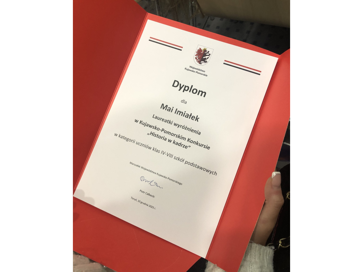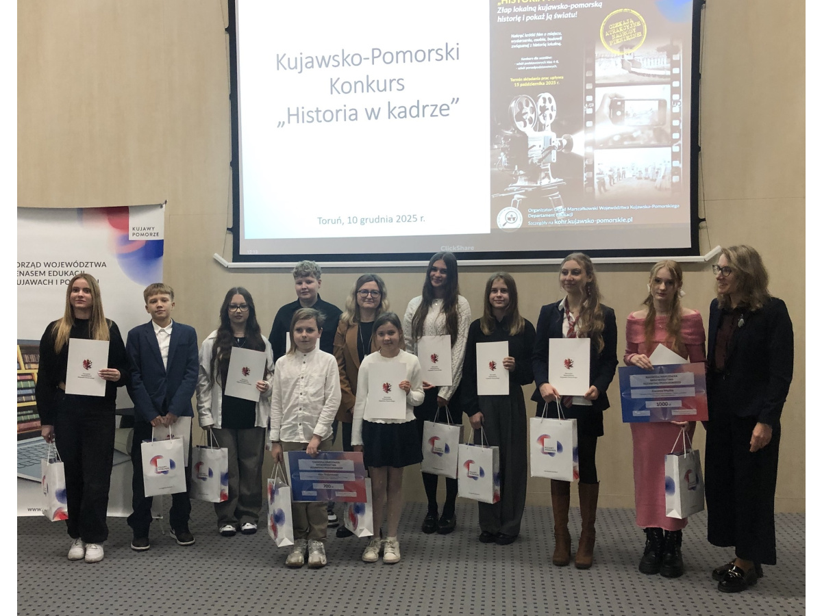 Na tym jednak się nie skończyło, bo w Urzędzie Marszałkowskim w Toruniu odbyło się dzisiaj uroczyste ogłoszenie wyników wojewódzkiego konkursu „Historia w kadrze”. Film Mai Imiałek dotyczący historii obozu w Potulicach otrzymał wyróżnienie, a jego autorka została uhonorowana dyplomem Marszałka Województwa. Serdecznie gratulujemy!