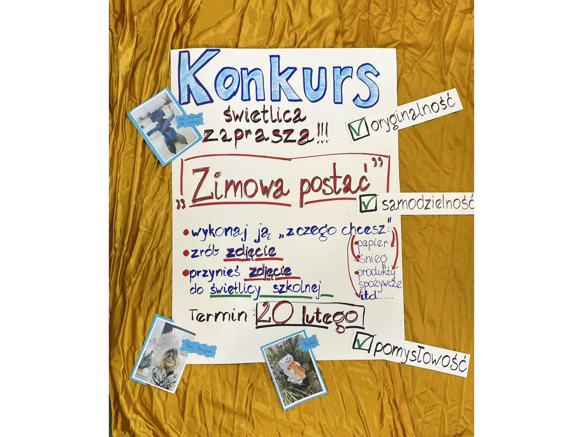 Zapraszamy wszystkie dzieci z klas 1, 2 i 3 do wzięcia udziału w zimowym konkursie. Czekamy na zdjęcie pomysłowej, zimowej postaci, stworzonej z „czego chcesz”. Możesz wykonać ludzika ze śniego, artykułów spożywczych, klocków, roślin… Pamiętaj, że ma to być postać ZIMOWA. Sfotografuj gotowe dzieło i oddaj zdjęcie paniom ze świetlicy, do 20 lutego. Na zwycięzców czekają nagrody!