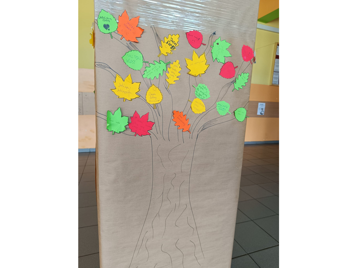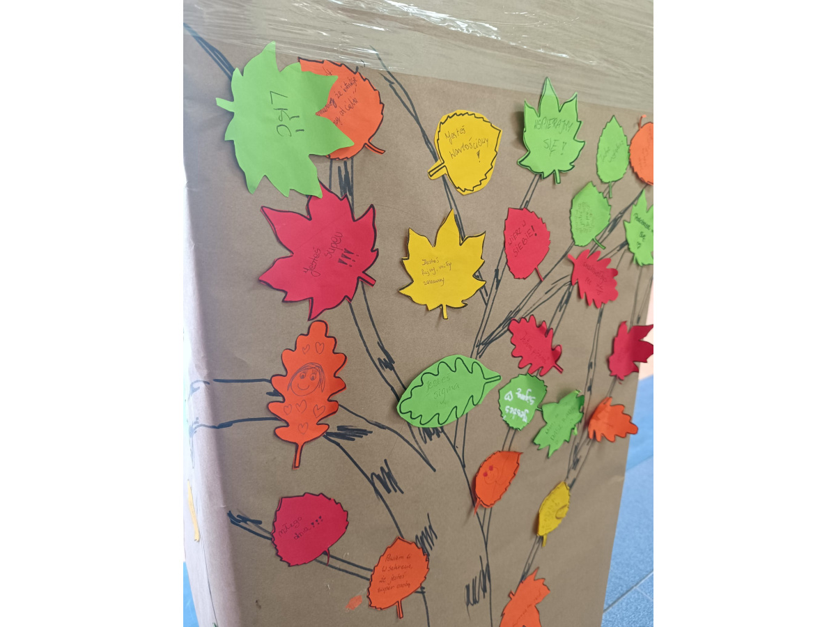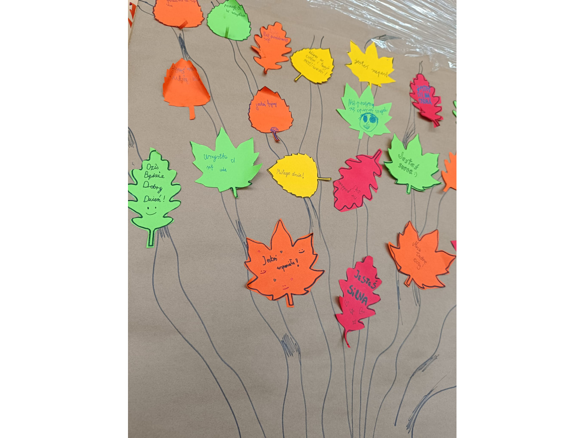 Pierwszego dnia stworzyliśmy wspólnie wyjątkową przestrzeń w holu szkoły – drzewa wypełnione liśćmi z przesłaniami od Was. Każdy liść to były słowa życzliwości, wsparcia, sprzeciwu wobec przemocy. Kolorowe, symboliczne, ale jednocześnie bardzo prawdziwe. Udowodniliśmy, że potrafimy mówić o tym, co ważne, i że zależy nam na innych. Niech te liście w holu jeszcze przez jakiś czas przypominają nam, że nasza szkoła to miejsce, gdzie każdy ma prawo czuć się bezpiecznie. I że każdy z nas ma wpływ na to, jaka ona będzie.