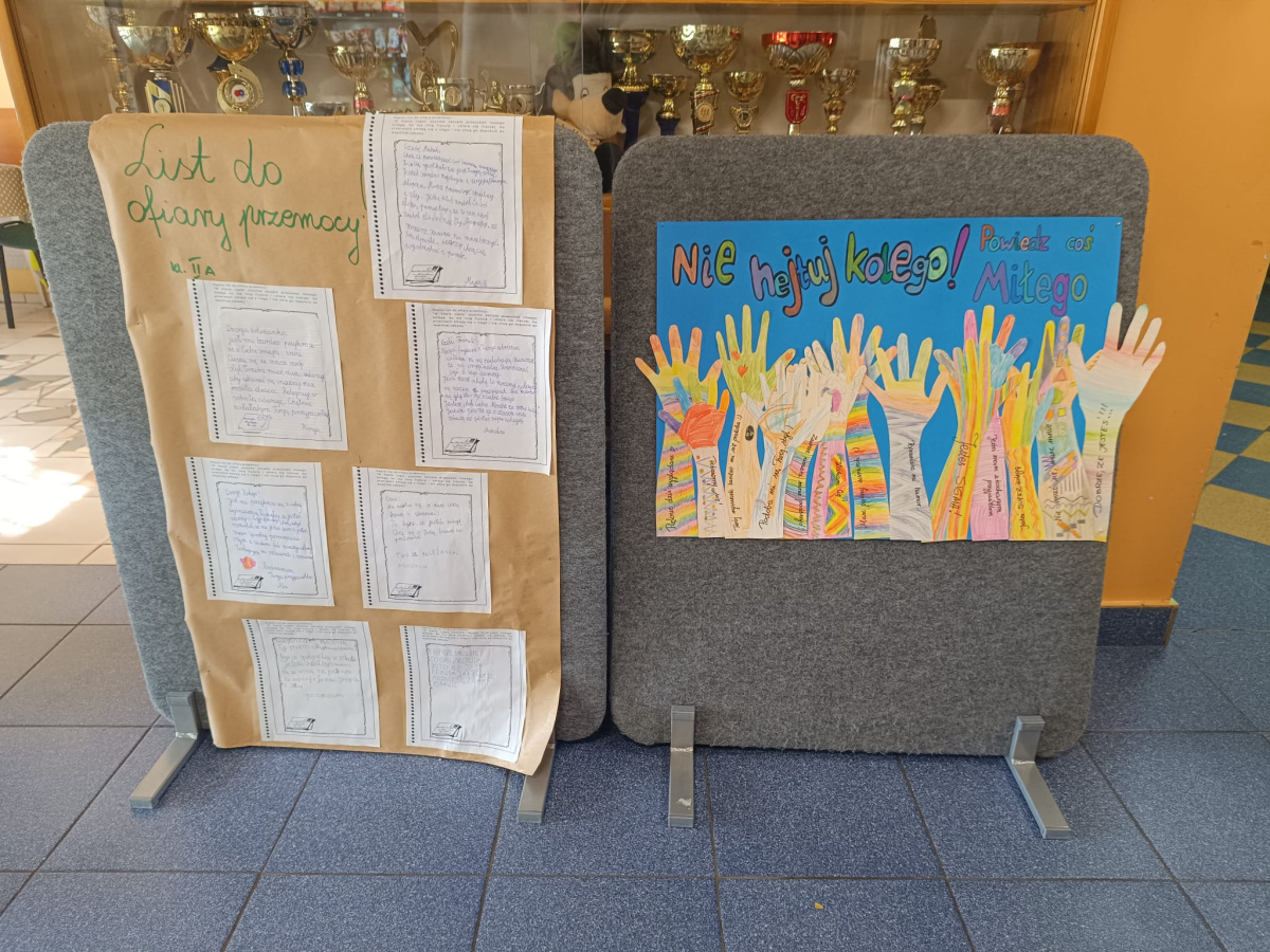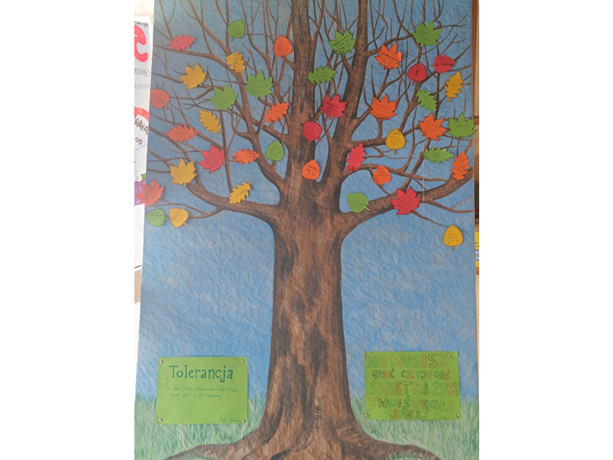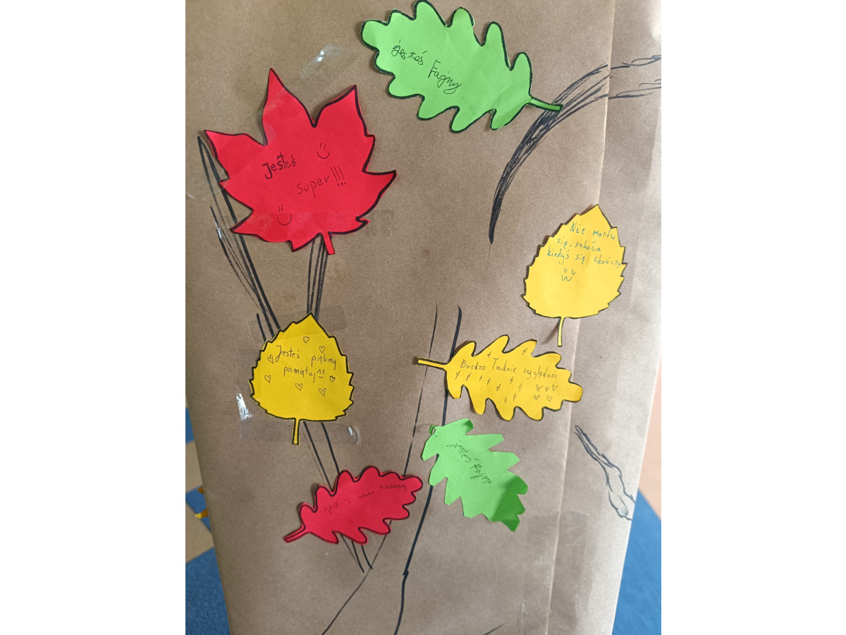 Pierwszego dnia stworzyliśmy wspólnie wyjątkową przestrzeń w holu szkoły – drzewa wypełnione liśćmi z przesłaniami od Was. Każdy liść to były słowa życzliwości, wsparcia, sprzeciwu wobec przemocy. Kolorowe, symboliczne, ale jednocześnie bardzo prawdziwe. Udowodniliśmy, że potrafimy mówić o tym, co ważne, i że zależy nam na innych. Niech te liście w holu jeszcze przez jakiś czas przypominają nam, że nasza szkoła to miejsce, gdzie każdy ma prawo czuć się bezpiecznie. I że każdy z nas ma wpływ na to, jaka ona będzie.