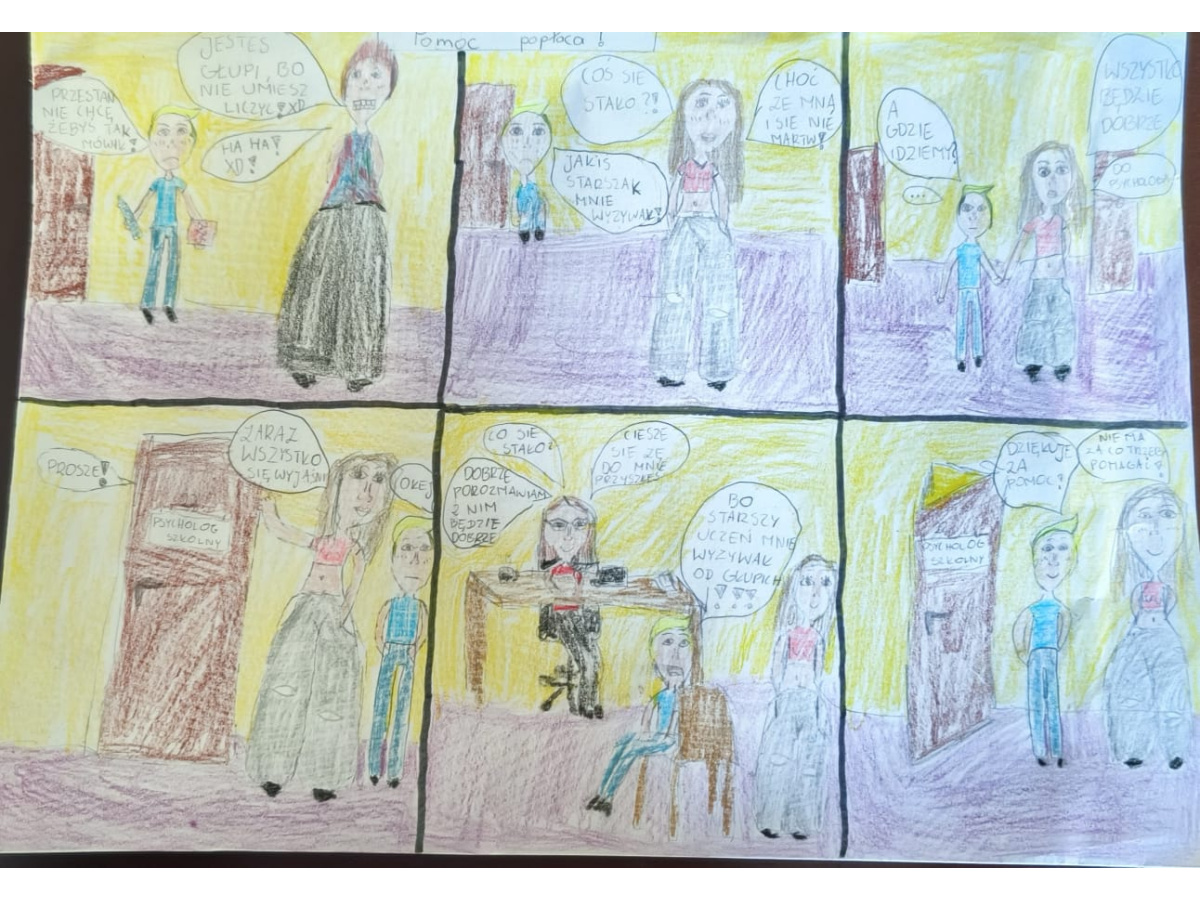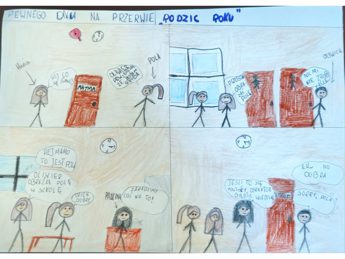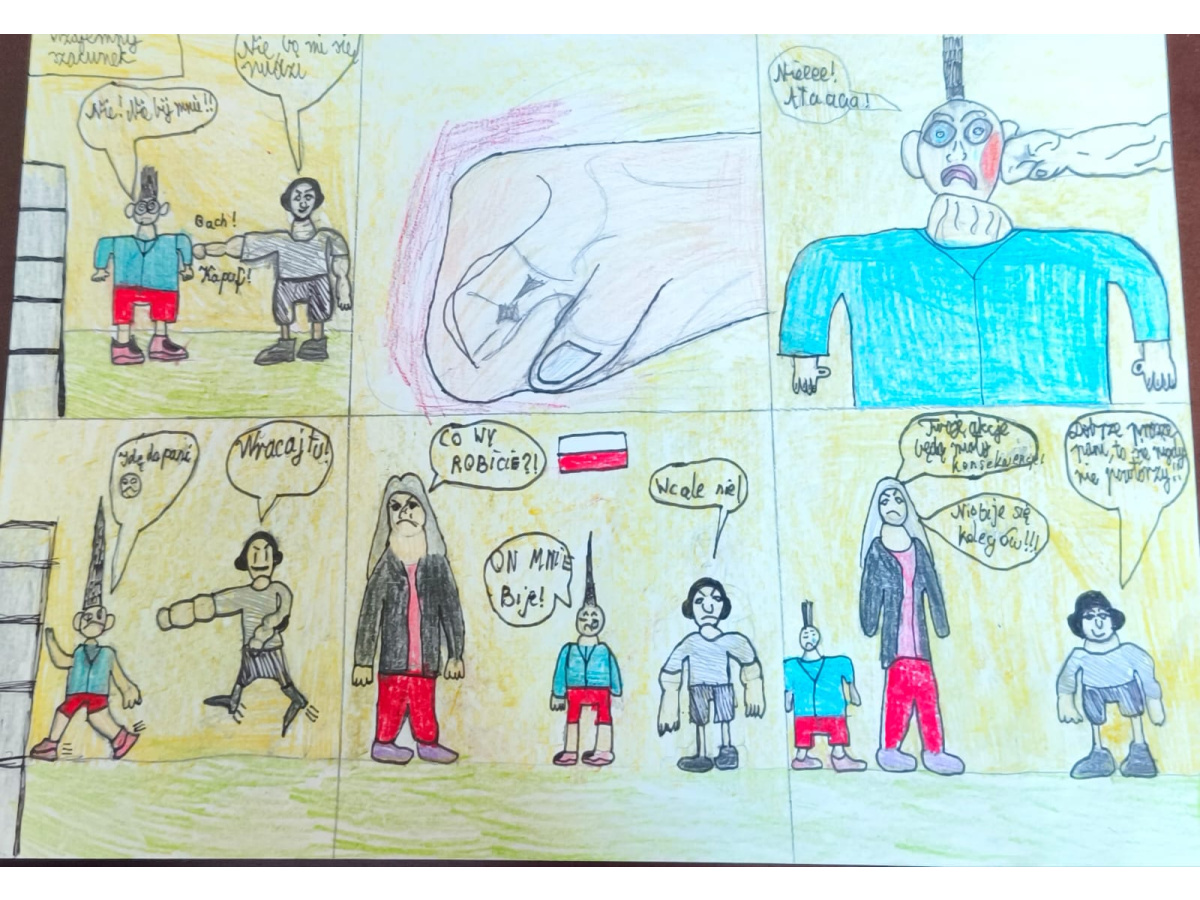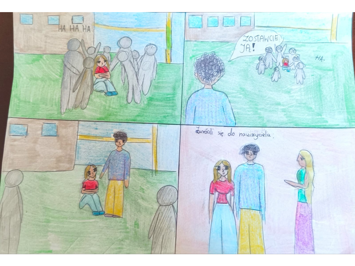 - Klasy 5 i 6 stworzyły komiksy, w których pokazały, jak można przeciwdziałać przemocy. Z humorem, kreatywnie, ale z mocnym przesłaniem – że każdy może reagować i każdy może pomóc.