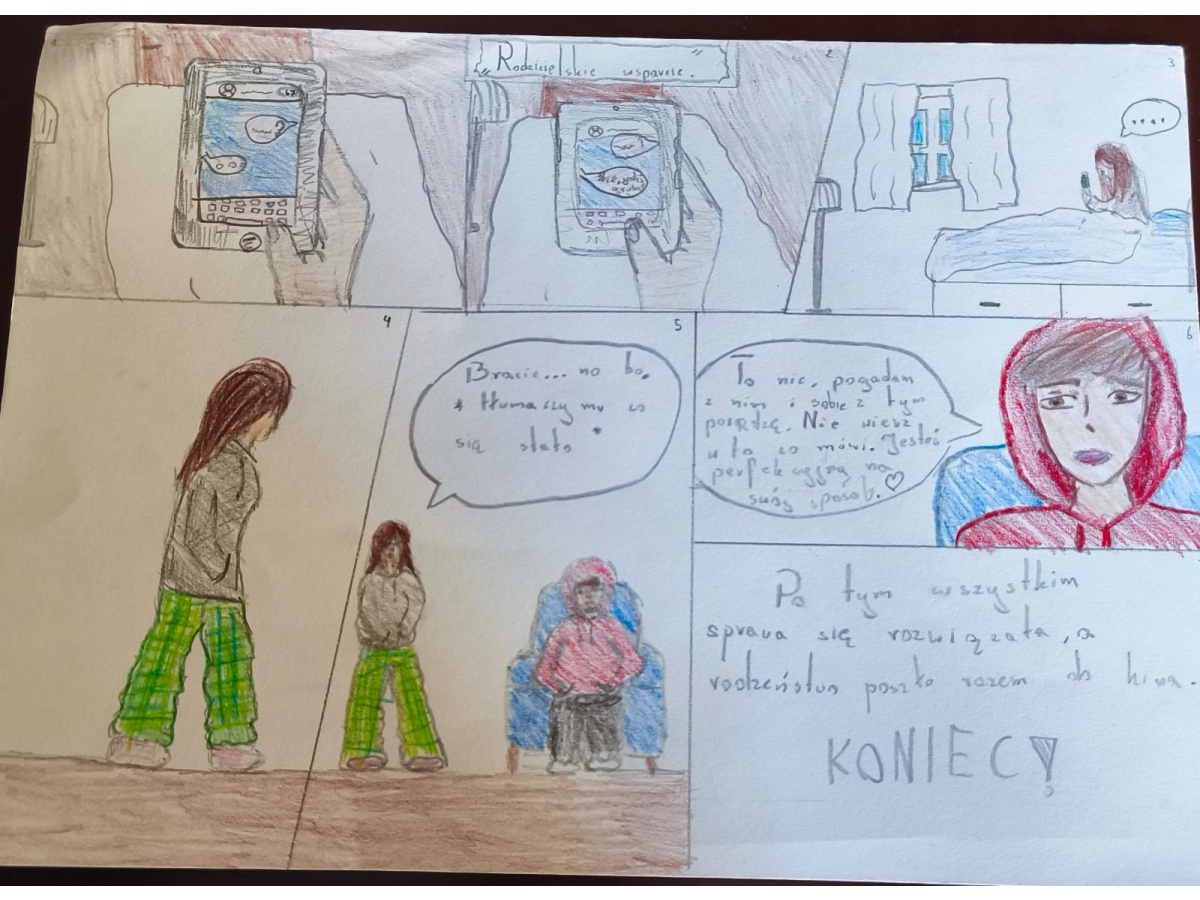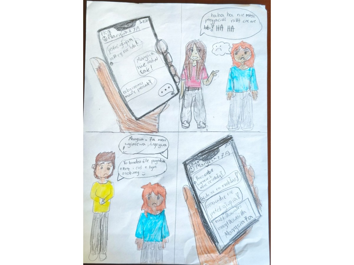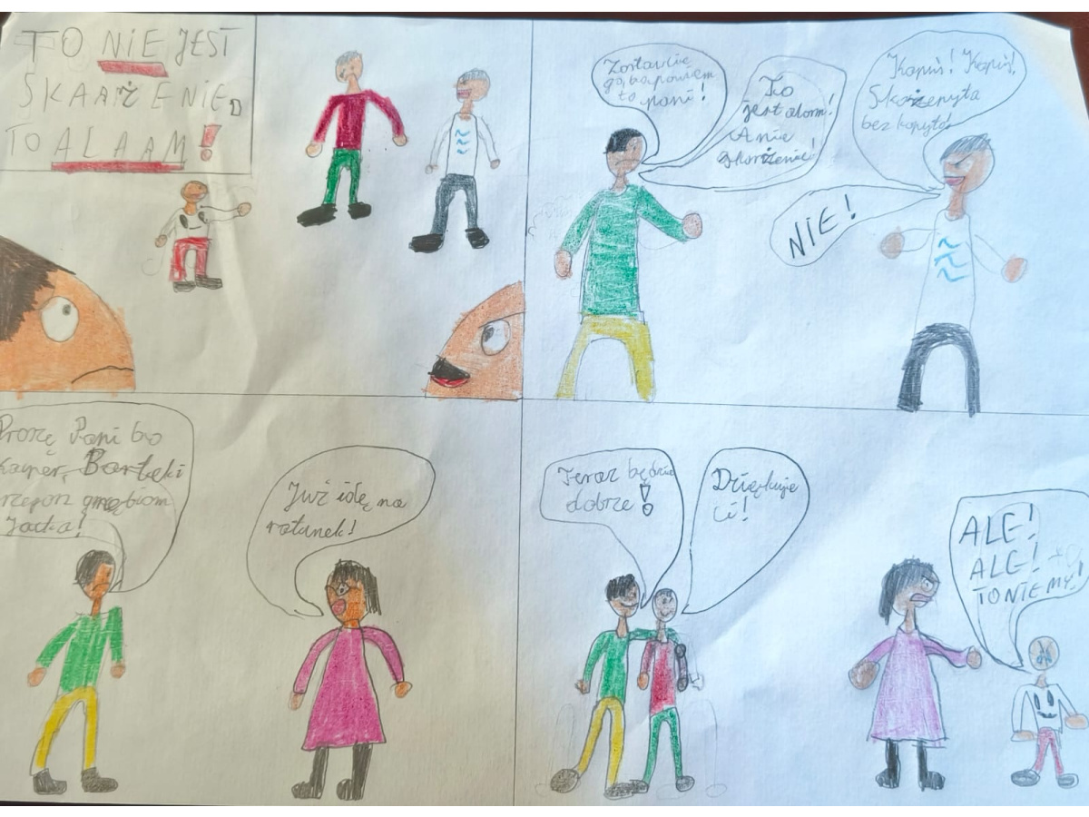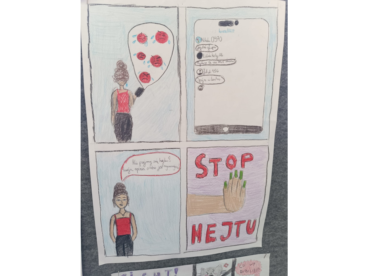 - Klasy 5 i 6 stworzyły komiksy, w których pokazały, jak można przeciwdziałać przemocy. Z humorem, kreatywnie, ale z mocnym przesłaniem – że każdy może reagować i każdy może pomóc.