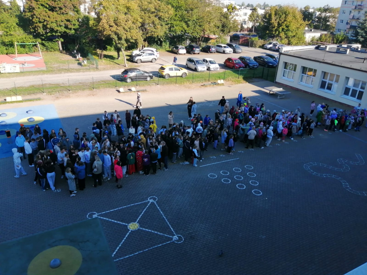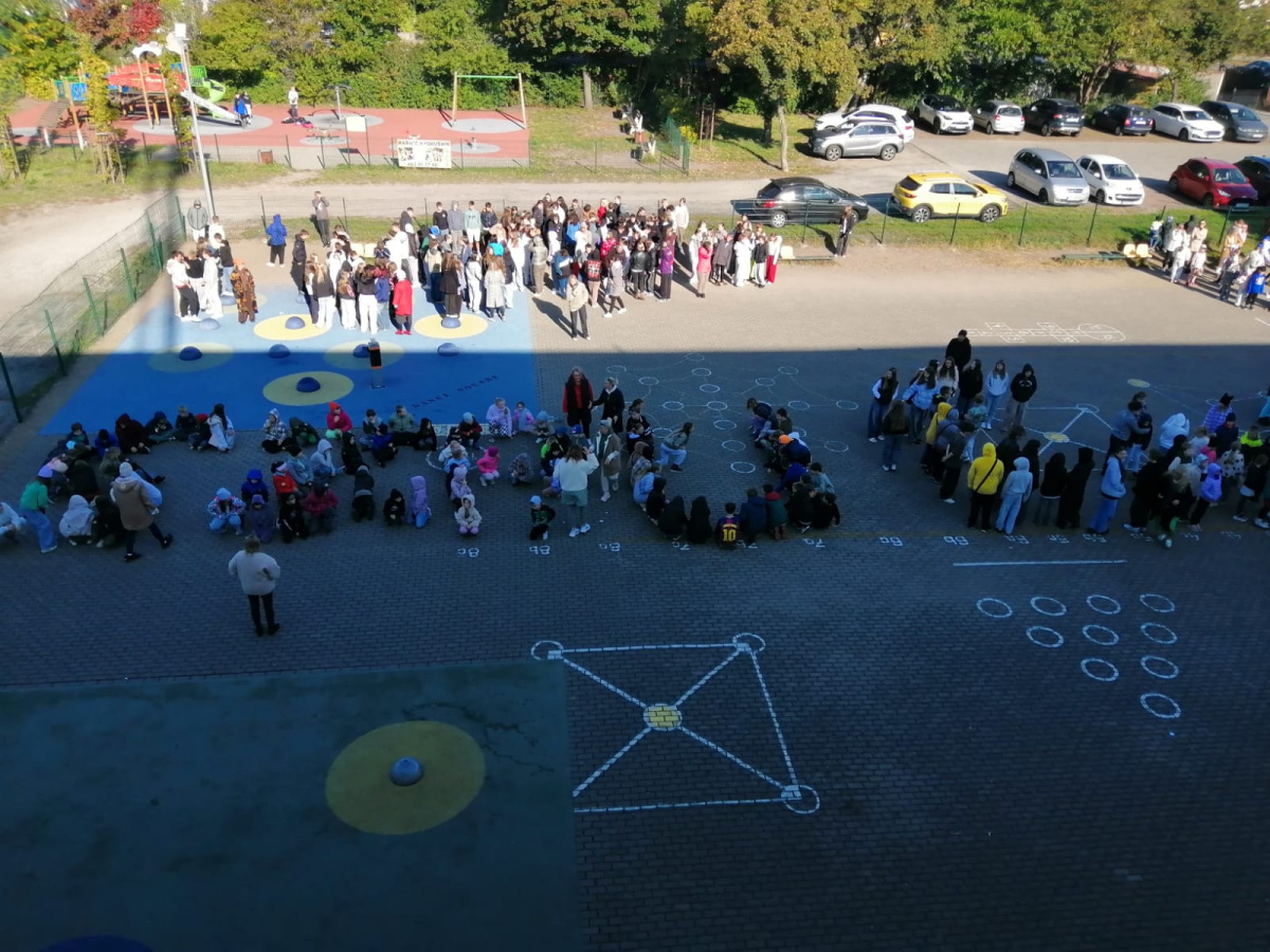 Drugiego dnia pokazaliśmy siłę wspólnoty. Ustawialiśmy się klasami w litery, które razem tworzyły hasła przeciwko przemocy. Było to czymś więcej niż tylko wspólnym działaniem – to był obraz prawdziwej współpracy i jedności. Pokazaliśmy, że każda osoba – tak jak litera w wyrazie – ma swoje niepowtarzalne miejsce i znaczenie, że siła tkwi w różnorodności, wzajemnym szacunku i wspólnym celu.