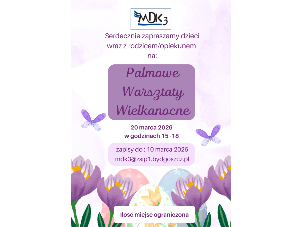 Serdecznie zapraszamy na wielkanocne warszaty palmowe, które poprowadzi Pani Magdalena Zdunek. Zapisy: należy wysłać maila na adres placówki - mdk3@zsip1.bydgoszcz.pl w treści wpisujemy imie i nazwisko dziecka oraz rodzica, telefon kontaktowy.