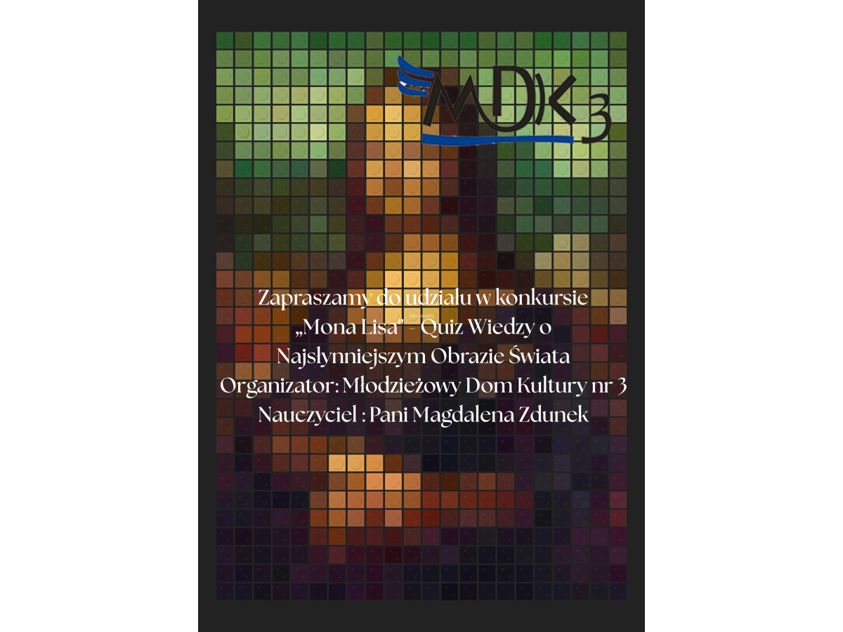 Konkurs ma charakter indywidualny i jest skierowany do wszystkich chętnych uczniów. Uczestnicy zmierzą się z pytaniami dotyczącymi autora obrazu (Leonarda da Vinci), historii dzieła, namalowanej postaci czy technik malarskich.